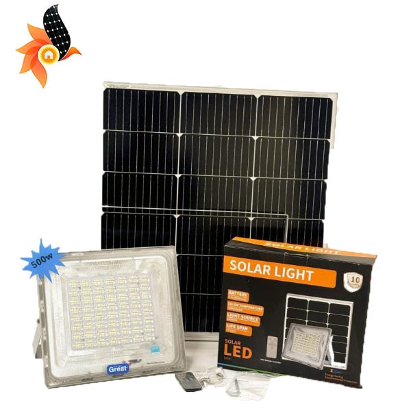 پروژکتور خورشیدی 500 وات گریت سولار (Great Solar) با همکاری برند سامسونگ، محصولی با کیفیت بالا و مناسب برای روشنایی محیط‌های وسیع در فضای باز است. این پروژکتور به‌ویژه برای مناطقی که دسترسی به برق شهری محدود یا غیرممکن است، طراحی شده است. در ادامه، مشخصات فنی و ویژگی‌های این محصول را بررسی می‌کنیم: